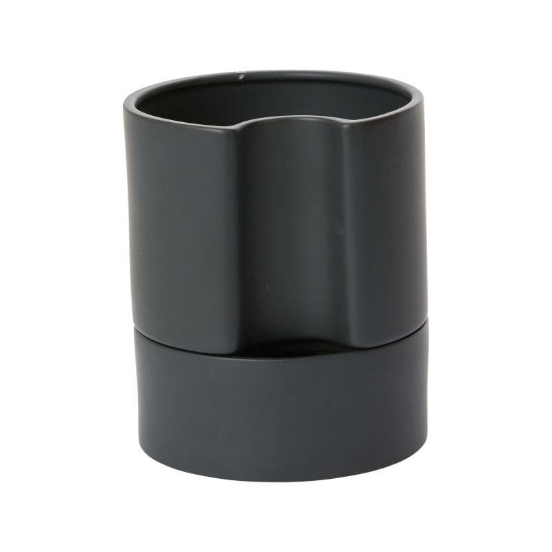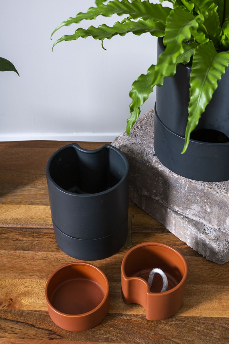 The New Jett Pott in matte black is both versatile and stylish, designed to be utilized as as a traditional pot and saucer, or as a self-watering pot. For self-watering application, the soil needs to be saturated when plant is initially potted and the reservoir should be filled with water.