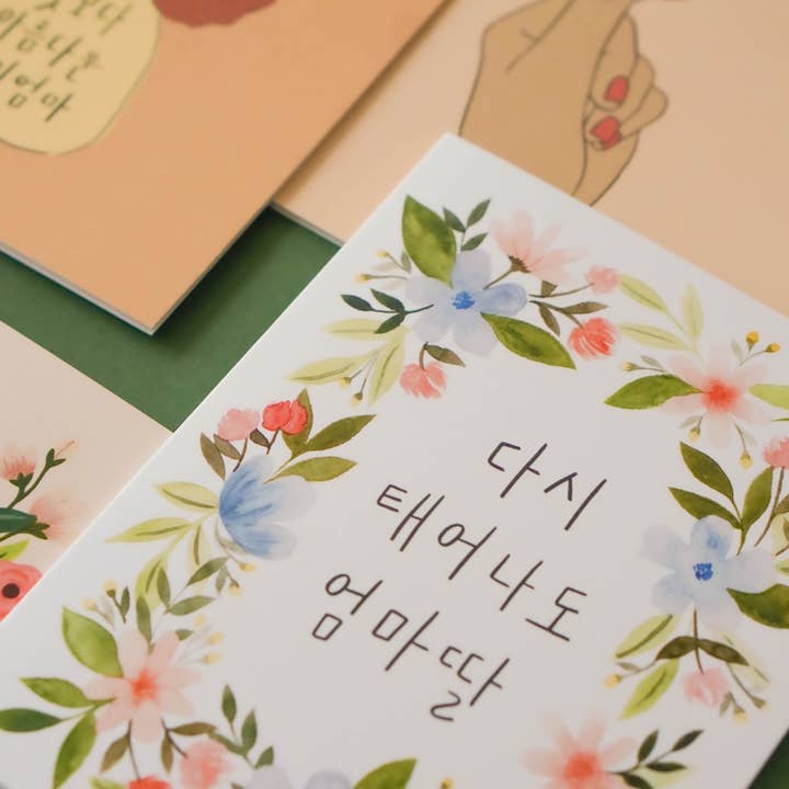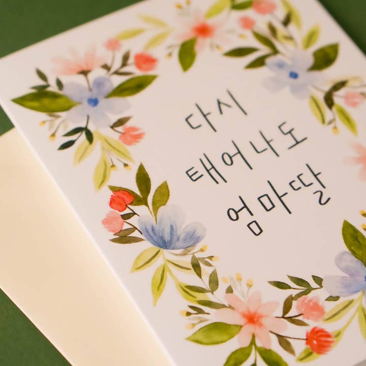 "다시 태어나도 엄마딸" - roughly translates to "If I was born again, I'd want to be your daughter again, mom." Tell your mom you love her with this card featuring original lettering and a floral painting.
