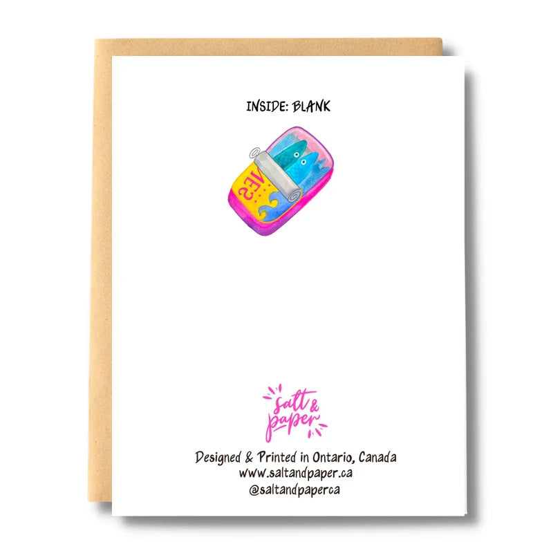 Anchovies packed tightly together, just like our bond! This fun, quirky card is perfect for showing love or friendship. With the playful message "So glad we're tight," this card will surely bring a smile to anyone's face.