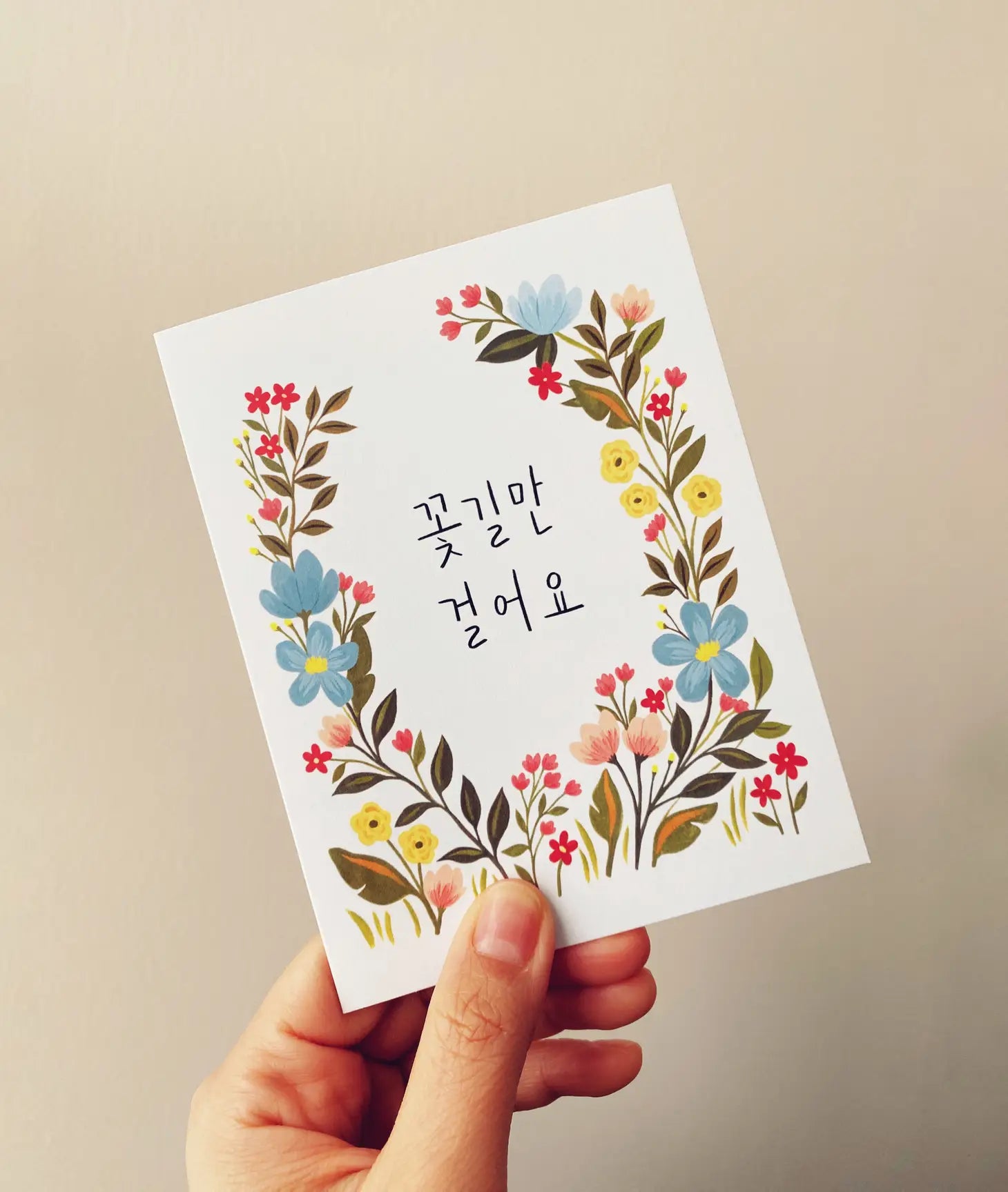 "꽃길만 걸어요" - this roughly translates to "let's walk on flower roads only." in Korean, "flower roads" mean "happy days." wish someone happiness by writing them a thoughtful message in this card.