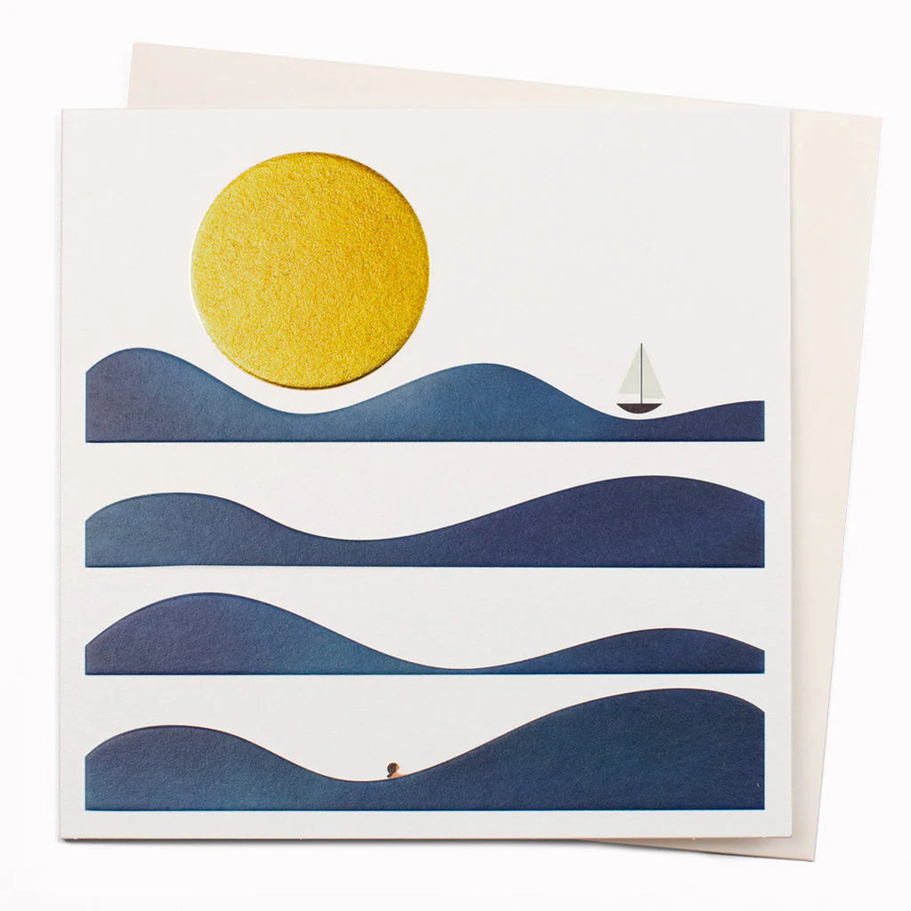 This playful greeting card features a swimmer and sailboat on sea waves, designed by artist Blanca Gomez.