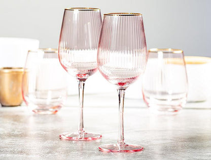 Elevate your entertaining with this chic, sophisticated Optic Goblet with Gold Rim. Crafted from pink optic glass with stylish gold trim around its rim, this stemmed goblet adds a fun rosa hue to any vintage you pour for an elegant complement to any occasion.