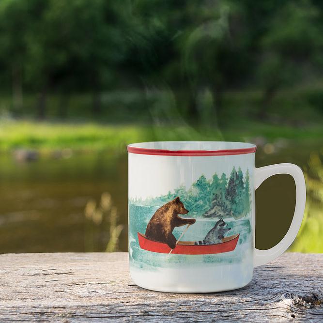 Celebrate your love of the great outdoors and wildlife with this charming Animals in Canoe Mug. Crafted out of stoneware, this ivory mug features a beautifully painted scene of a bear and raccoon paddling a bright-red canoe across a picturesque lake amidst a forest background – A a captivating way to enjoy your morning coffee or tea!
