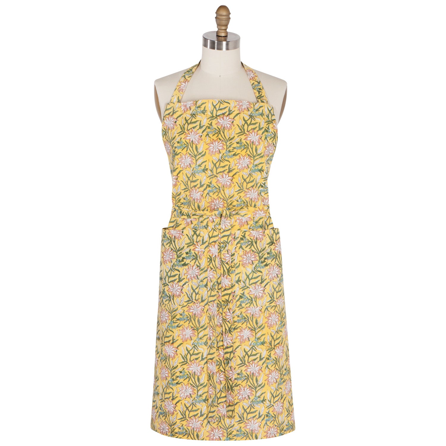 Hand block-printing holds a long and rich history in Indian textiles. It’s a skilled craft, shared generation to generation. Each hand-carved wooden block is stamped in ink and applied with expertise to the fabric creating complex, interconnected patterns. When you wear a hand block-printed apron, the artistry shines through and the beauty can be found in the variations of each print.