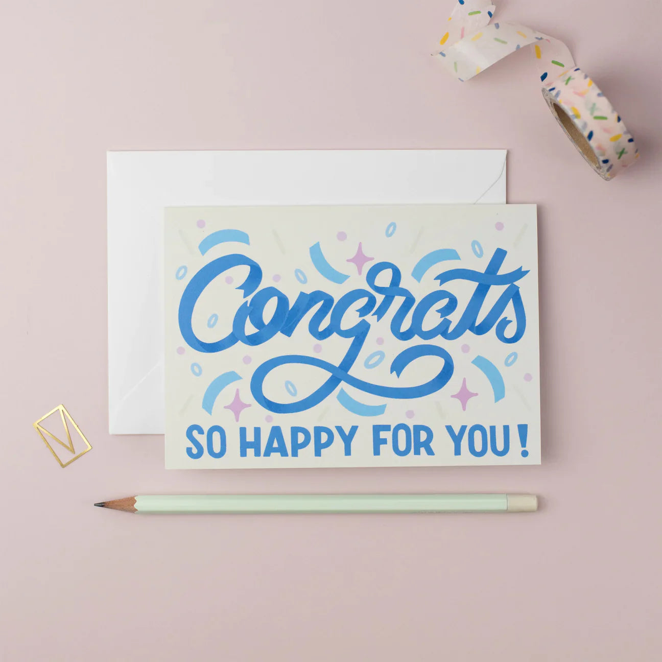 This congratulations card features hand-lettering by artist Roselly Monegro of The Inking Rose and reads 'Congrats, so happy for you!'. It is perfect to send to congratulate someone on getting engaged, a new job or moving house. Any cause for a celebration!