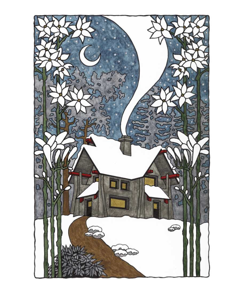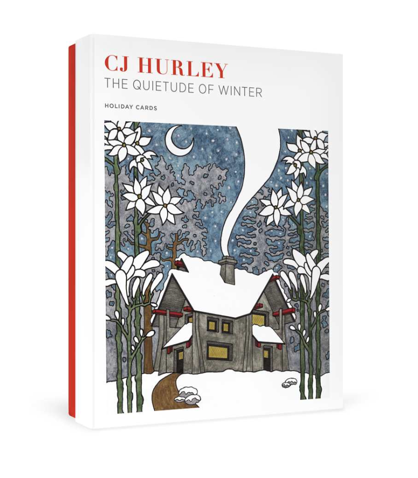 CJ Hurley (American, b. 1967) The Quietude of Winter CJ Hurley believes that art is one of the central joys of life. His paintings evoke the spirit of the international Arts and Crafts movement (c. 1880–1920), which sought to bring beauty into people’s homes. In these holiday cards, snowdrifts cradle a peaceful home nestled between a waning moon and delicate winter foliage.