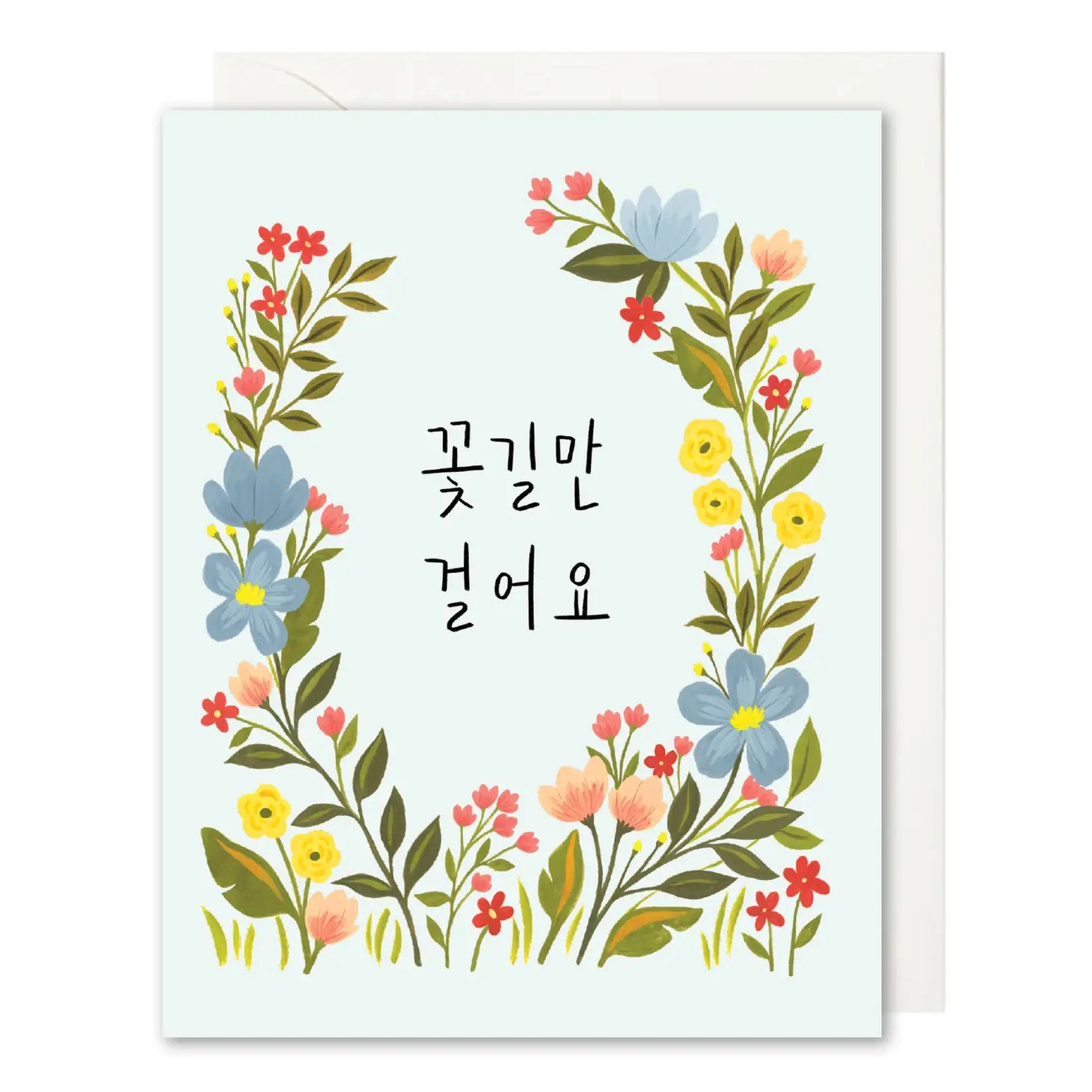 "꽃길만 걸어요" - this roughly translates to "let's walk on flower roads only." in Korean, "flower roads" mean "happy days." wish someone happiness by writing them a thoughtful message in this card.