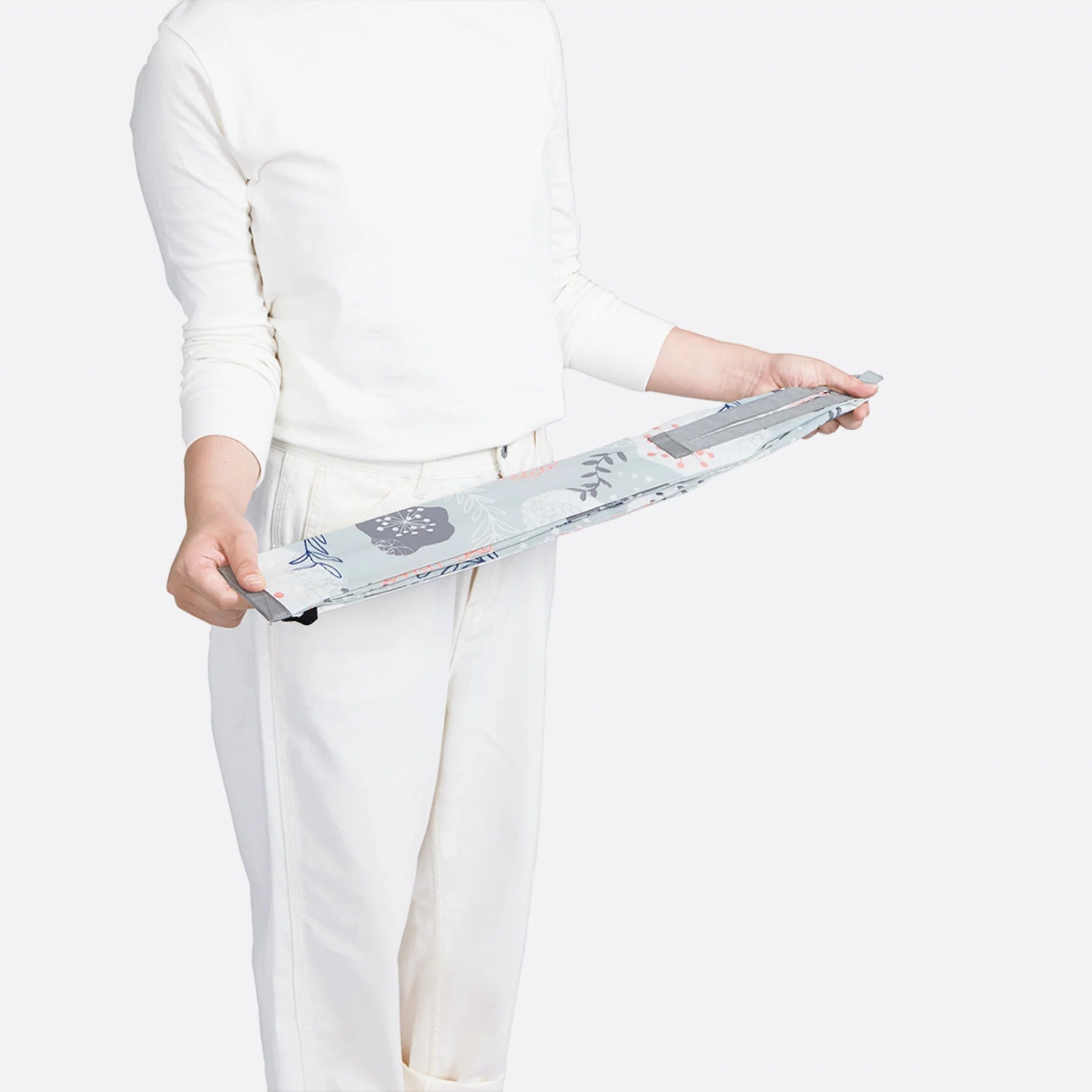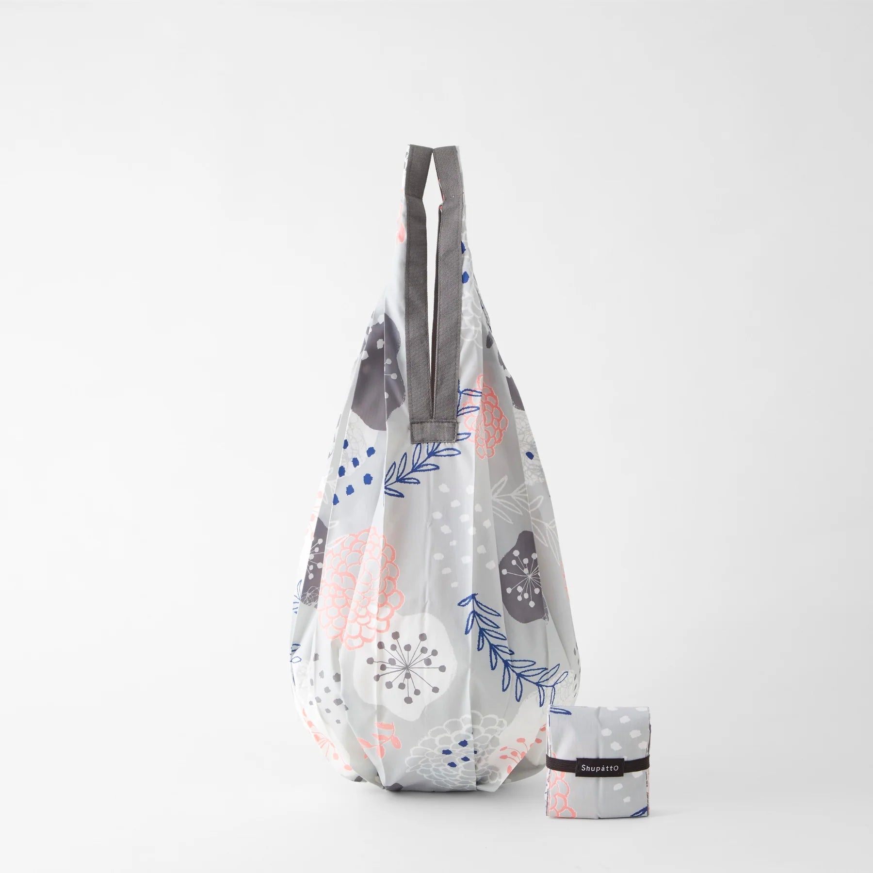 Pull the bottom and handles into a strip — it folds into a compact square about the size of a handkerchief. Tuck it into your main bag and you're ready to go.