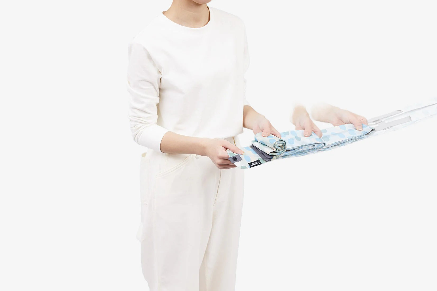 Just pull both ends sideways and roll. It folds into a compact bundle with a smooth, satisfying snap. -