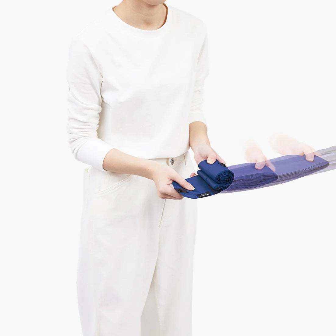 Just pull both ends sideways and roll. It folds into a compact bundle with a smooth, satisfying snap. -