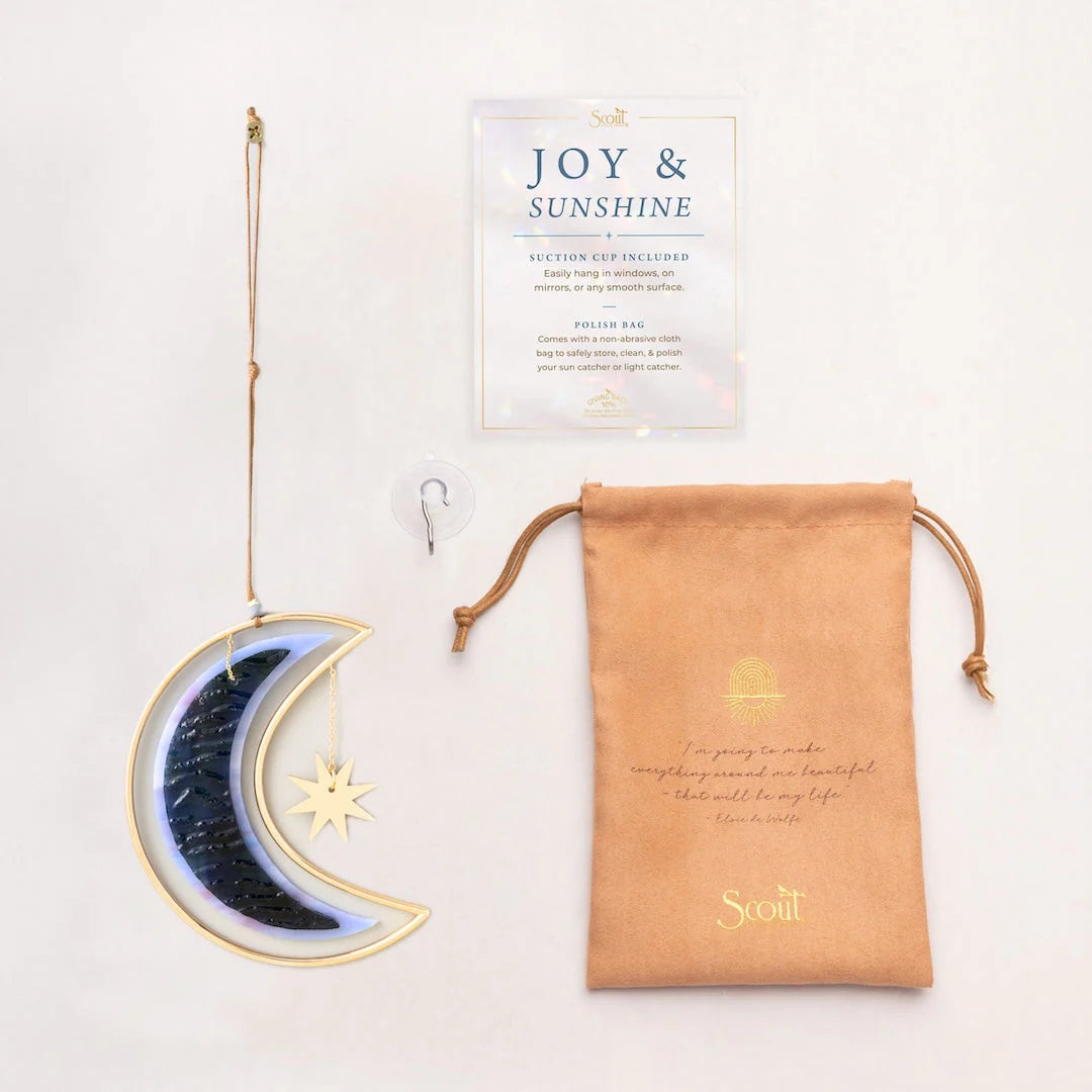 This stained glass light catcher turns sunlight into a playful dance of colors. Hand-cut glass pieces are framed in gold with moon and star designs, adorned with glass and metal beads on a natural cord. It’s a charming way to brighten any space and makes a delightful gift.