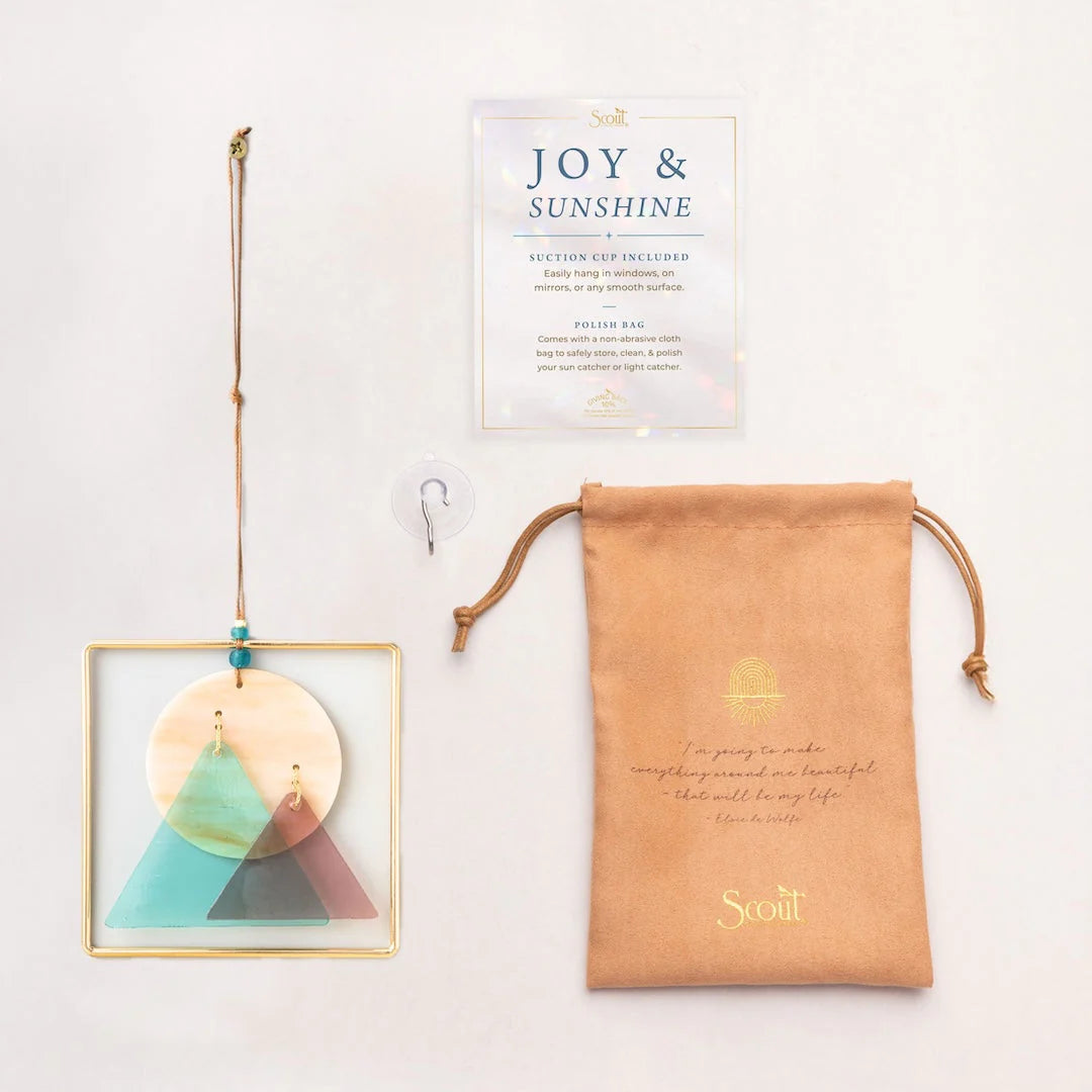 This stained glass light catcher turns sunlight into a colorful dance. Hand-cut glass framed in gold shines in four lovely designs. With glass and metal beads on a natural cord, it adds a charming touch. Comes in a polished bag, perfect for gifting some magic!