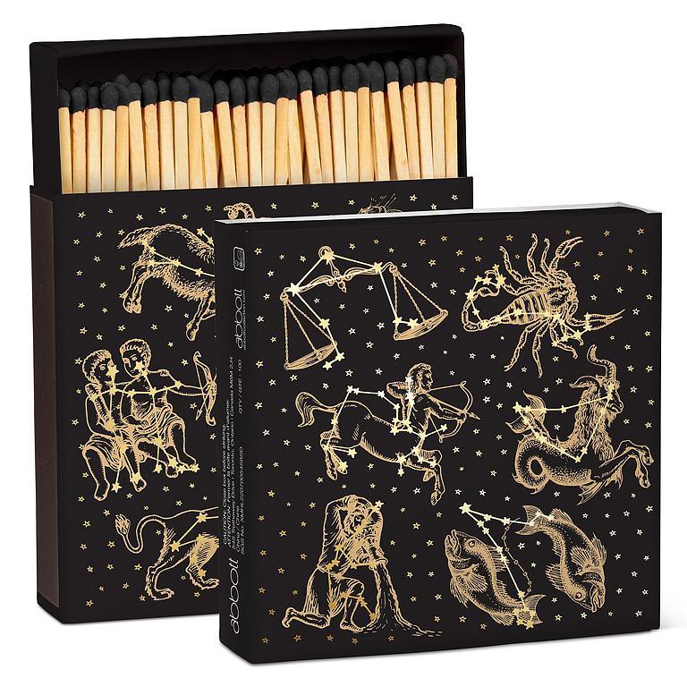 Ignite your fire with astrological style! These black matchboxes feature gold zodiac icons and contain 100 wooden matchsticks. Perfect for candles, fireplaces, or as a fun gift alongside your favourite tealights.